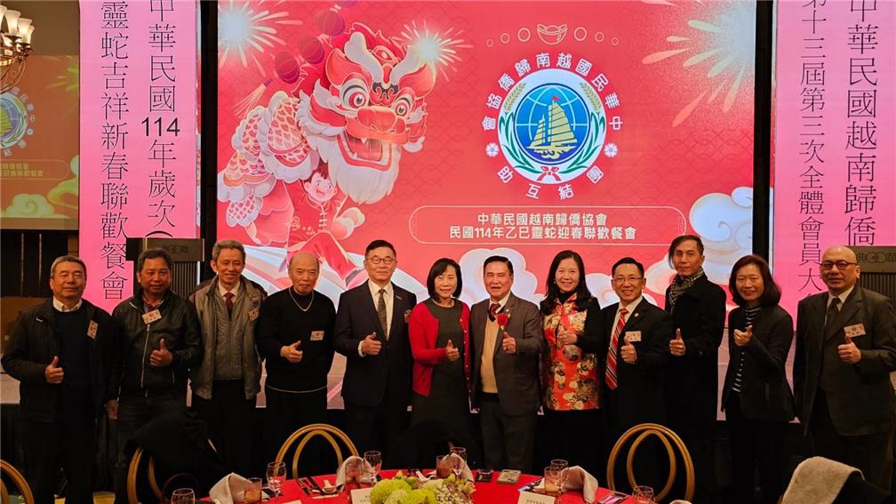 中華民國越南歸僑協會於114年2月9日舉辦「114年靈蛇吉祥迎春聯歡餐會」,僑務委員會榮主任秘書幼娥代表出席,榮主任秘書於致詞時感謝該協會多年來關懷及照顧國內歸僑,協助且支持僑務工作,並祝福出席人員身體健康、蛇年行大運。