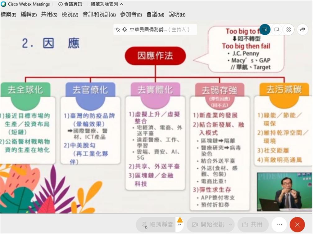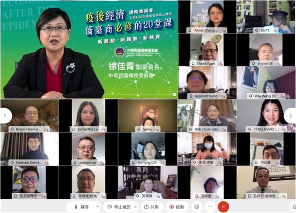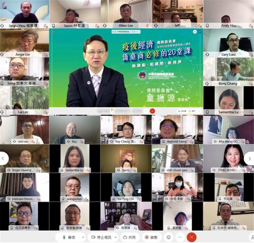 本會為協助僑臺商共同研討疫後如何策勵擘劃新的事業策略布局,以「新觀點、新趨勢、新視界」自2020年11月4日至12月4日,規劃辦理「未來科技與產業發展線上講座-疫後經濟僑臺商必修的20堂課」,共計有海外45國家地區、100餘位商會會長、重要幹部,以及僑臺商企業董事長、總經理及執行長等高階管理者參加。