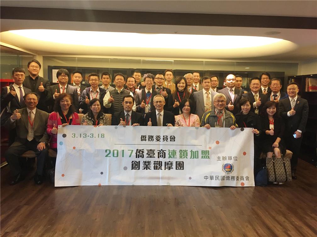 僑務委員會為鼓勵僑胞回國交流商機,邀請有意創業展業及瞭解國內連鎖加盟業現況之海外僑臺商,藉由參加本活動增進相關專業知能,以期擴大海內外連鎖加盟商機,並利媒合臺灣優質連鎖企業至海外展業,特於2017年3月13日至18日舉辦「2017年僑臺商連鎖加盟創業觀摩團」。該觀摩團除進行8場專題演講外,尚安排至6家企業進行參訪,並於臺北和臺中各舉辦1場商機媒合洽談會,各洽邀國內知名連鎖加盟8家廠商與會。另於活動後安排團員參觀「2017臺北國際連鎖加盟大展」,以增加海外連鎖加盟企業與國內相關產業交流商機,團員均表示此行收穫豐富,對渠等海外事業經營發展甚有助益。經初步調查統計,本活動團員投資意向項目包含餐飲、食品原物料、早午餐等。