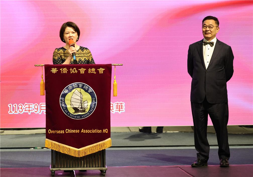 華僑協會總會舉辦「113年中秋節聯歡會」,僑務委員會張參事淑燕(左)致詞,說明僑生工作,並感謝該總會對僑生政策的支持。