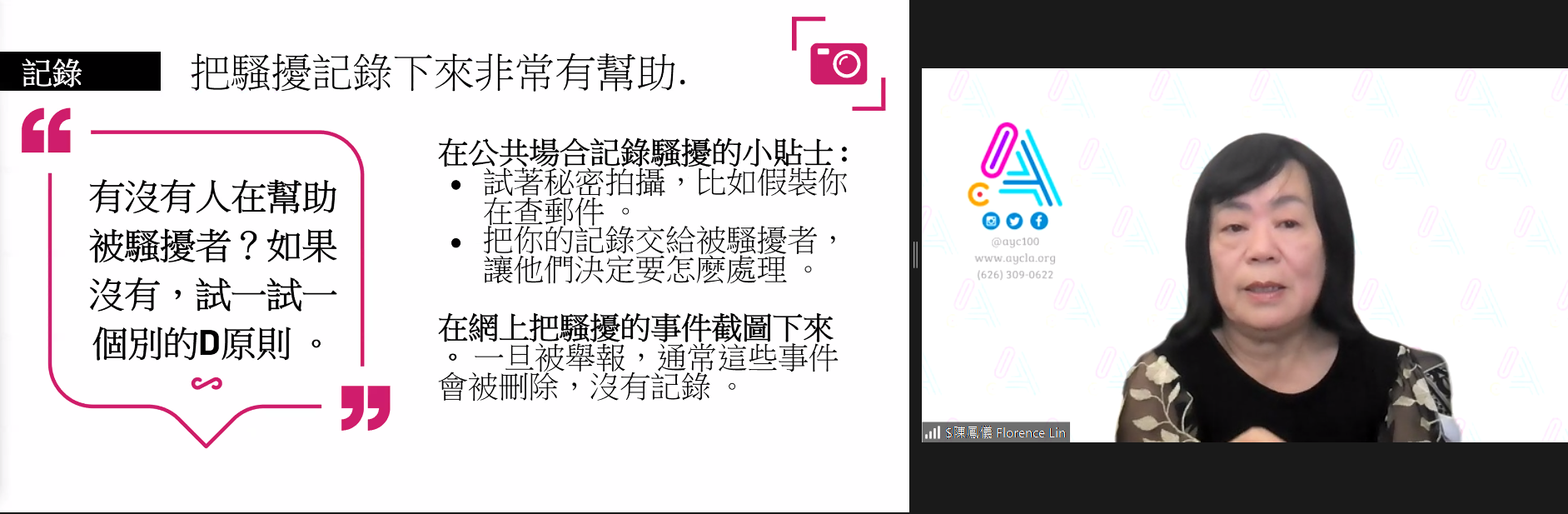 亞裔青少年中心社區公關經理陳鳳儀(Florence Lin)首先主講「停止亞裔仇恨 目擊者5D方法介入」。在目擊亞裔仇恨事件發生的當下,我們除了留意自身的安全,也可以參考以下5D的方式介入協助受騷擾者,5D包括Distract(轉移分散騷擾者注意力)、Delegate(找人協助)、Document(運用手機紙筆等方式記錄存證)、Delay(推遲行動、安撫受騷擾者)、Direct(直接干預騷擾事件)。