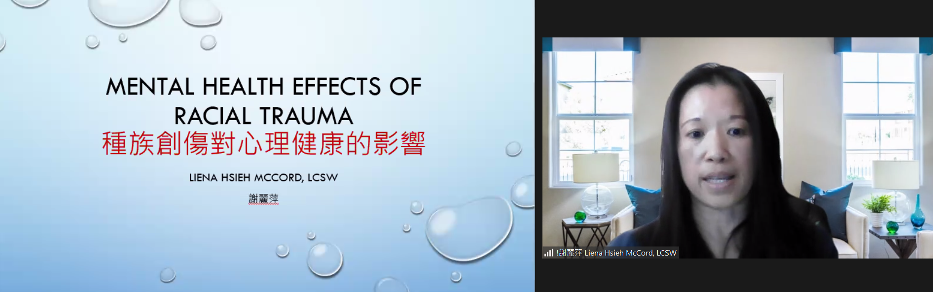接續由執照臨床社工謝麗萍講師(Liena Hsieh)分享主題為「種族創傷對心理健康的影響」,她首先說明「種族創傷」係指因遭遇種族偏見與種族歧視、種族主義與仇恨犯罪而造成的精神和情感傷害。常見的情形包括接觸、目睹對另一個種族的施虐、目睹身邊親友所遭受的種族主義謾罵、擔心個人安危,以及自身被歧視的經歷等等。我們可以藉由以下的方式來應對,包括自我照顧、練習正念和冥想、在自己感到舒適的範圍內參與種族正義運動、注意種族主義的微攻擊,並與自己信任的人練習該如何應對,也可以尋求在治療種族創傷方面專業心理人員的協助。