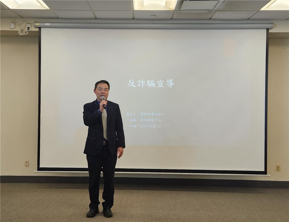 講座由副會長盧瑞平主持。僑教中心主任黃正杰致詞時指出,近年詐騙手法不斷翻新,尤其年終節慶期間為詐騙高峰期,提醒僑胞務必提高警覺,透過正確資訊與防範觀念,守護自身與家人的財產安全。