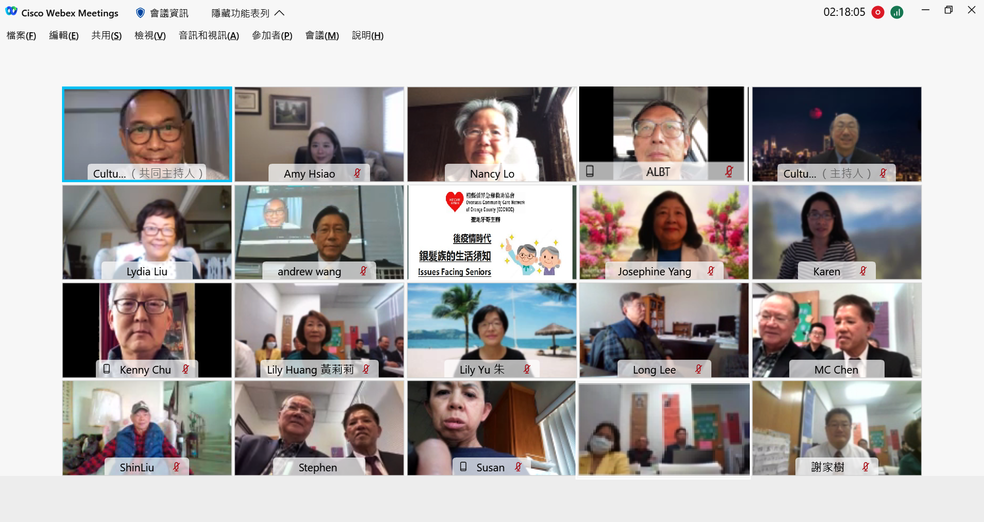 杜武青擔任當天講座主持人,理事暨僑務諮詢委員傅家康擔任線上會議技術總監。杜武青表示,南加臺裔社區60、70歲高齡僑民需要照護80、90歲更高齡父母或長輩的現象日益普遍,為協助高齡僑民順利適應高齡生活、照護好更高齡父母或長輩,協會特別舉辦這次講座,邀請專業人士提供銀髮族生活,尤其是後裔情時代生活的須知。