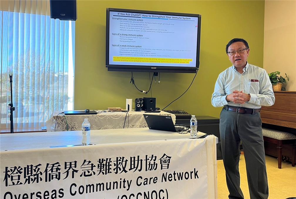 當天僑務委員暨橙縣僑界急難救助協會副會長謝家樹擔任主持人,會長暨僑務顧問陳景星則從橙縣前來參加講座。應邀出席的橙僑中心主任蕭蓓如致詞時感謝橙縣僑界急難救助協會與聖地牙哥中華科工會合作舉辦此次講座,讓僑民學習自我防護與後疫情時代提升免疫力的重要性,誠摯感謝大家的踴躍參與。