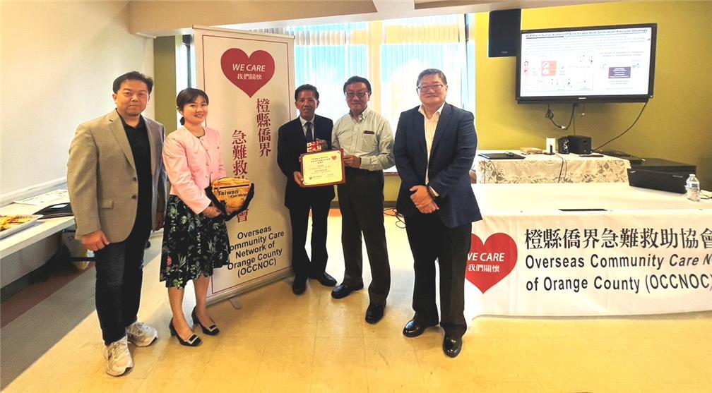 感謝主講人王一明的專業演講,橙僑中心主任蕭蓓如致贈僑務委員會防疫揹包、橙縣僑界急難救助協會會長陳景星致贈禮物卡及感謝狀。右起僑務委員謝家樹、王一明、陳景星、蕭蓓如、聖地牙哥中華科工會會長陳昭文。