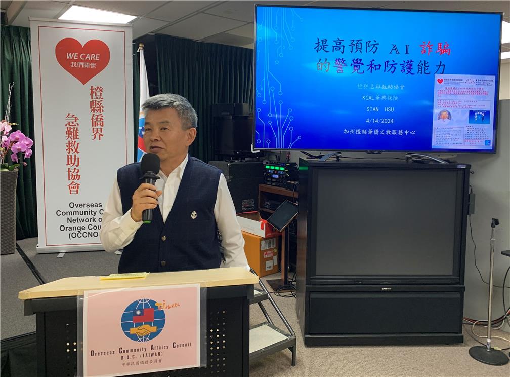 橙縣僑界急難救助協會113年4月14日在橙縣華僑文教服務中心舉辦「AI時代智能生活講座」,邀請電腦資安及人工智能(AI)專家徐士坦擔任主講人,讓僑民瞭解AI科技的進展與生活應用,傳授AI詐騙的防範知識,提高僑民預防AI防詐騙的警覺與防護能力。