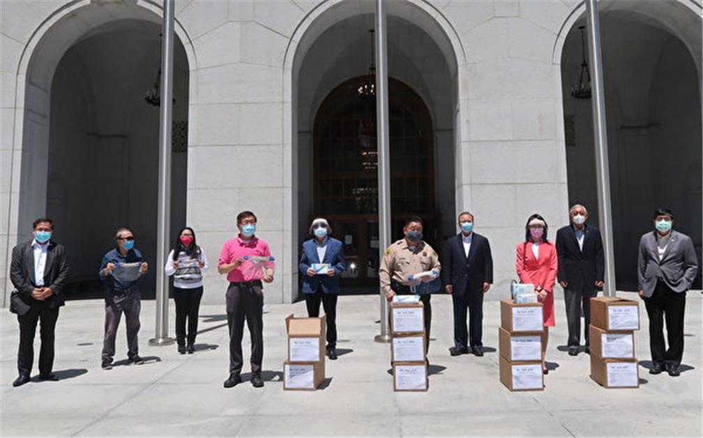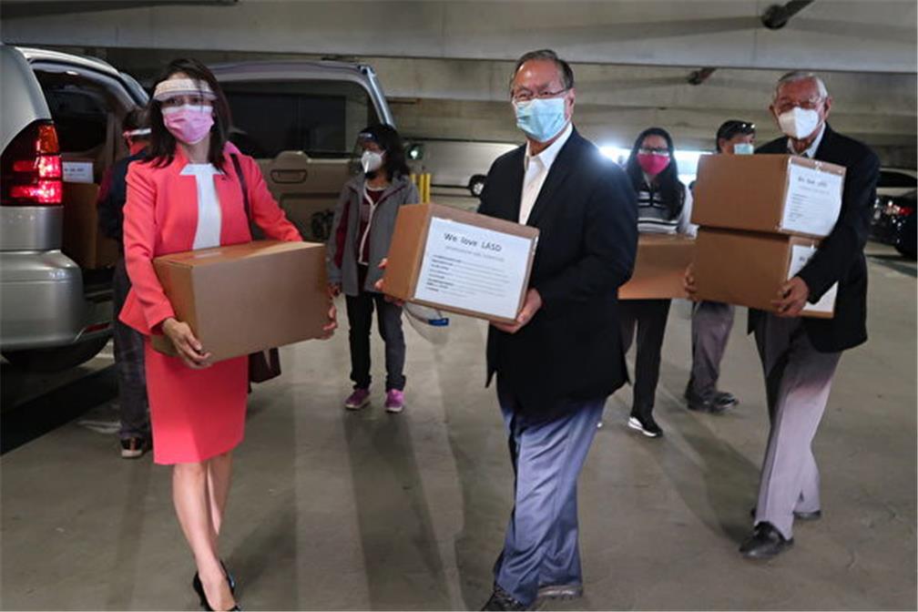2020年5月20日中午12時,洛杉磯僑界急難救助協會、橙縣急難救助協會、玉山科技協會、南加州臺灣旅館業同業公會、洛杉磯華商經貿聯誼會、美國好心人基金會、洛杉磯臺美商會、小李修車廠等來自臺灣的社團及企業,共同捐贈一萬件防護面罩及護目鏡、手套等個人防護設備予洛縣警察總局LASD ( Los Angeles Sheriff Department )。