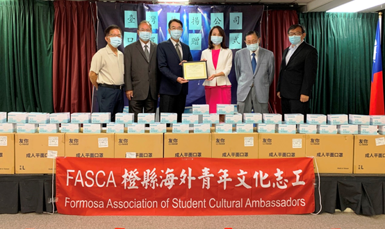 應邀觀禮的蔣翼鵬頒贈感謝狀給榮揚管理顧問公司,由僑務顧問張珮鑾代表接受。蔣翼鵬說,今年年初COVID-19爆發全球流行疫情,他就邀集橙縣僑界急難救助協會及僑界代表組成緊急應變小組。當時南加市場均買不到醫療口罩,擔任緊急應變小組醫療組組長的張珮鑾,一月底就想方設法透過東南亞供應商空運1500片醫用口罩捐贈給橙僑中心,以備僑民洽公、員工防疫所需。這次又因應FASCA海外青年文化志工協會橙縣分會將於7月25至26日舉行年度培訓,特別從臺灣空運MIT的國家級醫療口罩來美,對僑界及僑青的關懷熱忱,令人感佩。
