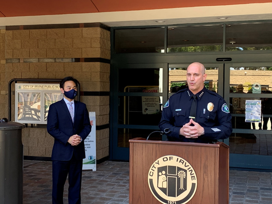 爾灣市警局局長海默爾(右)致詞感謝臺裔社區多年來對市警局的支持。圖左為爾灣市臺裔市議員郭正明。