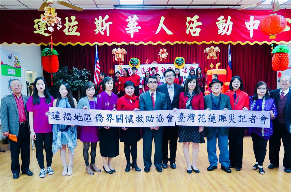 臺灣花蓮地震造成嚴重傷亡,災情慘重,達福地區僑界關懷救助協會關心臺灣花蓮災情,於107年2月17日在達拉斯華人活動中心發起愛心募款活動,該會會長曹明宗、副會長孟敏寬呼籲達福地區僑學各界踴躍參與,共同來為臺灣祈福,為花蓮災區重建盡一份心力。現場多位包含牟呈華等僑務榮譽職人員及達拉斯華人活動中心理事長許祖瑛等各僑團領袖亦共同參與。