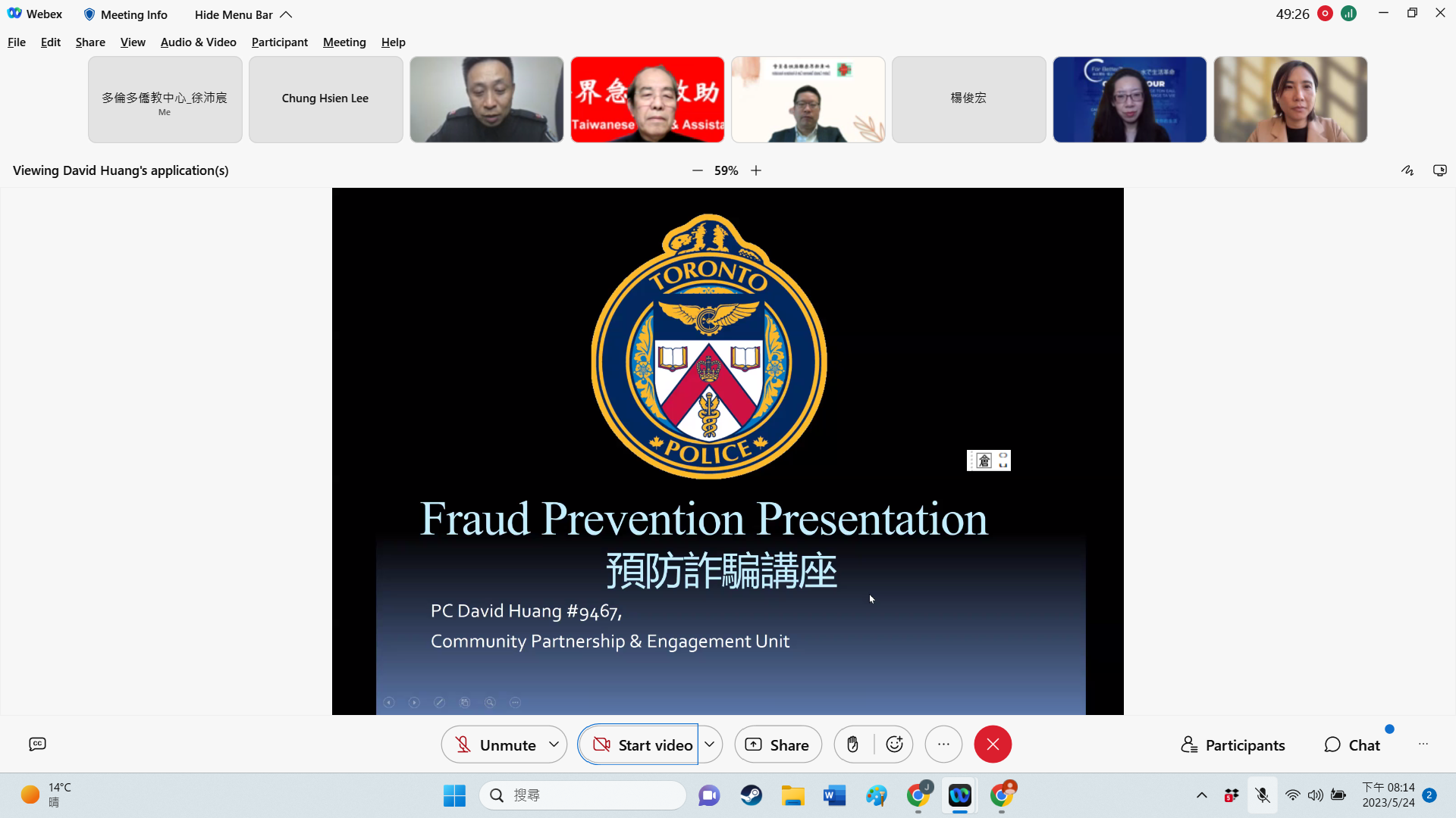 身處網路科技時代,周遭親朋好友被詐騙事件層出不窮,透過電話、簡訊、電子郵件、以及網路購物等方式常受騙上當,鑑於此,加東僑界急難救助委員會與多倫多市警局合作,於5月24日晚舉辦「防止詐騙」線上講座,邀請多倫多警局華人社區聯絡警官David Huang擔任主講,解說現今騙徒慣用詐騙技倆及與時俱進的新手法,吸引社區近90人上線參與。