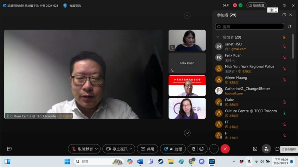 加東僑界急難救助委員會「防止詐騙」線上講座,由多倫多市警局警官David Huang主講。