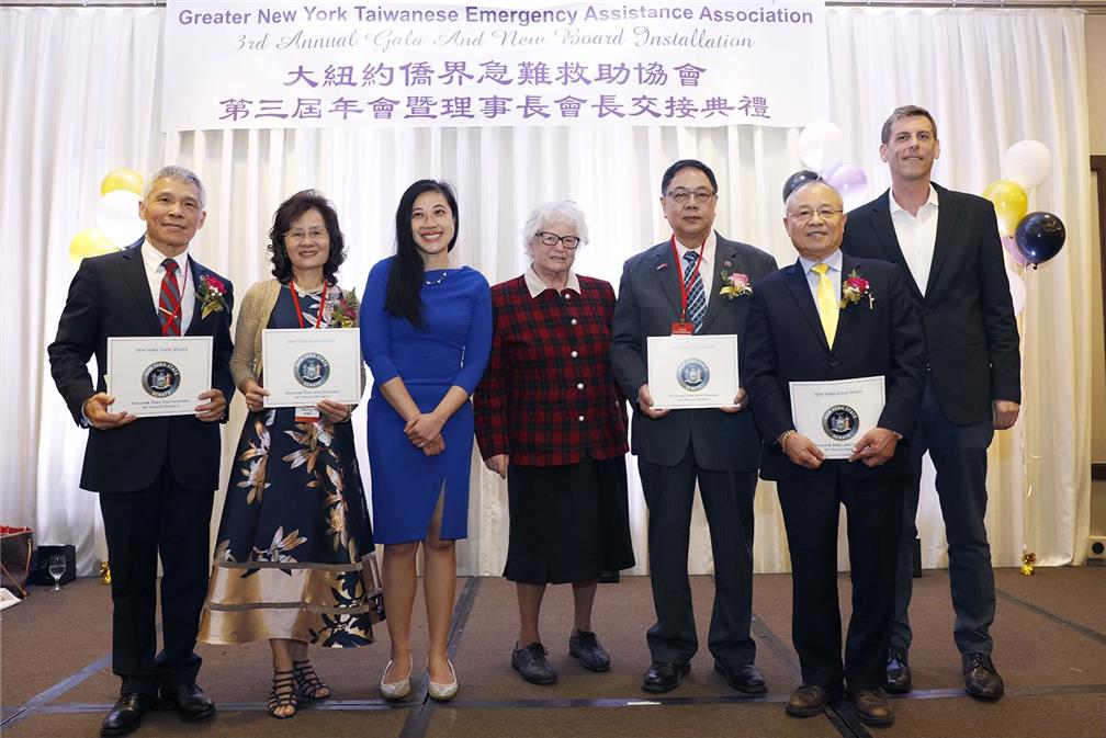 紐約州各級民選官員到場恭賀,頒發褒獎予大紐約區僑界急難救助協會(左起:新會長王寶銘、前會長林慧綺、紐約市議員黃敏儀、紐約州參議員史塔文斯基、新理事長郭至隆、前理事長王金智、州眾議員布朗斯汀)。