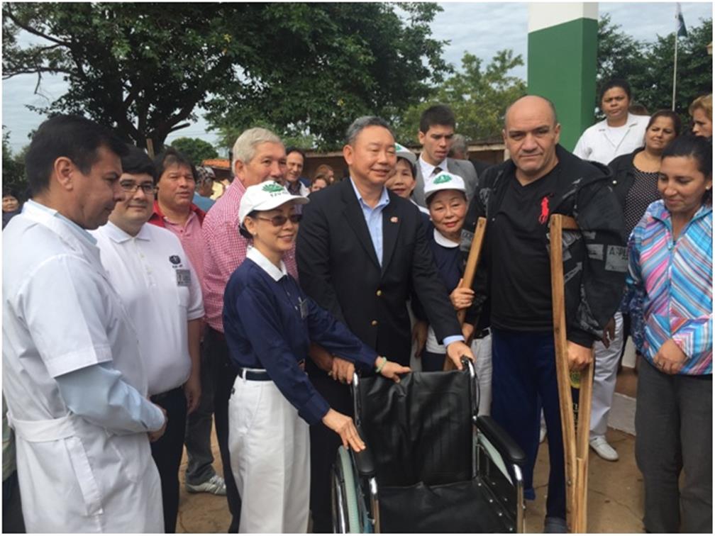俞大使(中)見證慈濟亞松森聯絡處捐贈巴國殘障人士輪椅