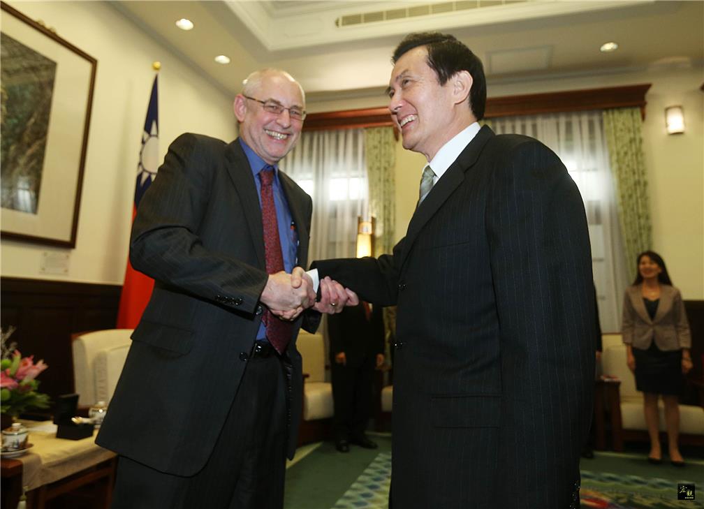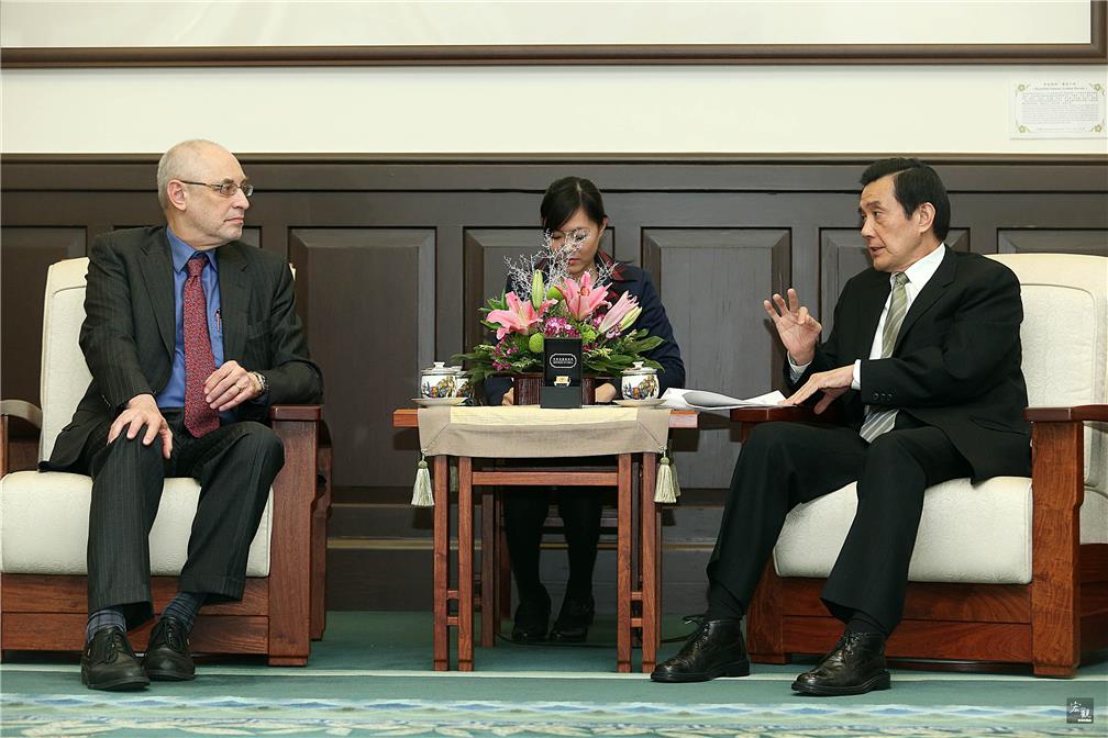 總統馬英九(右)16日在總統府,接見聯合國學者專家訪華團,針對多項議題進行意見交流。(中央社提供)