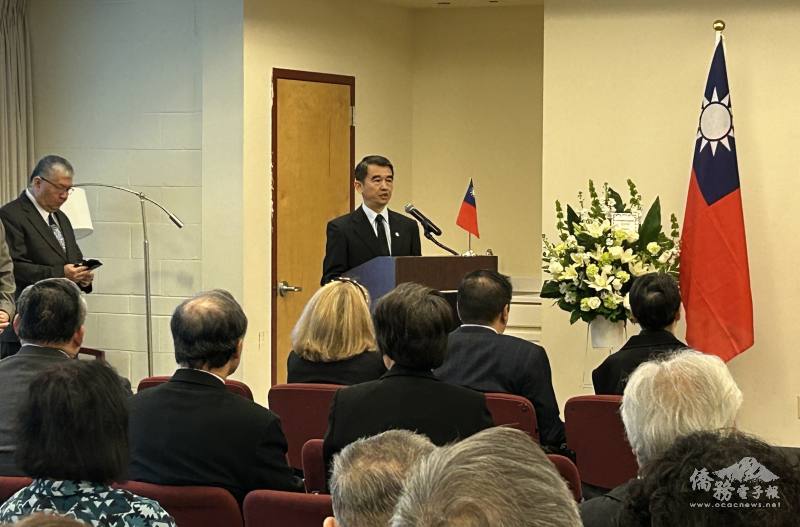 駐美代表處退伍軍人事務組組長劉慶元宣讀退輔會主委嚴上將的唁電