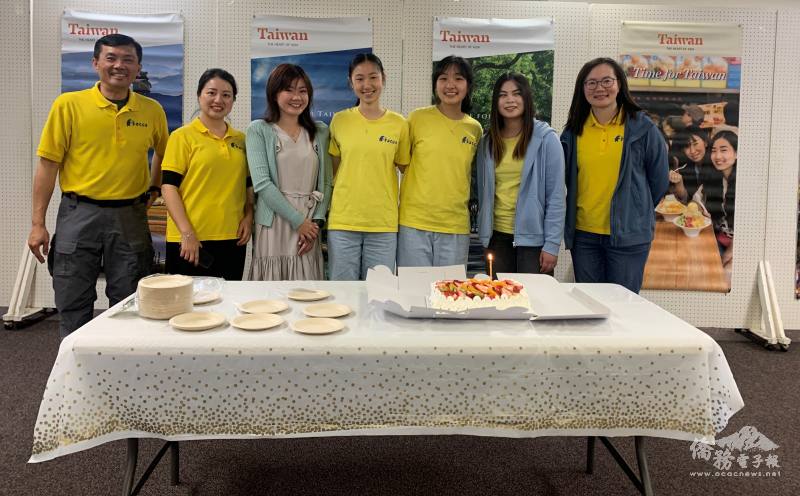 為1至3月出生的青年文化大使慶生。左起諮詢導師吳俊毅及榮于嫺、橙縣文教中心主任蕭蓓如、壽星陳芊慧、陳芊雲及張柔依、諮詢導師李梅如