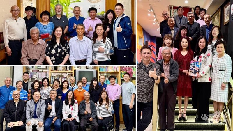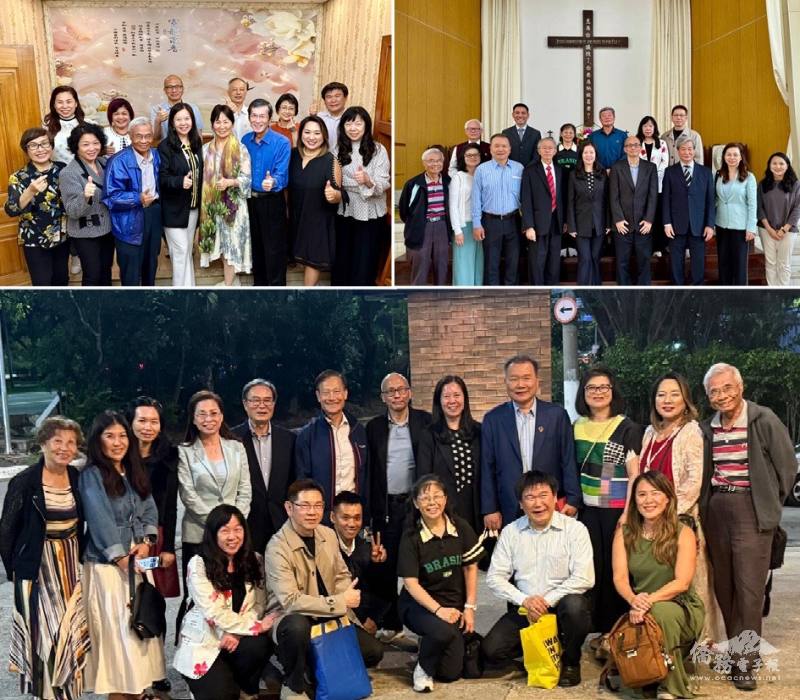 左上:童惠珍(前排左四)和聖保羅國際傑人會和會長廖玉翠(前排右四)及出席人員合影。右上:童惠珍(前排中)拜訪慕義教會和牧師鄭國卿(前排左四),與重要幹部合影。下:童惠珍(後排右五)拜訪臺灣商會,和會長蔡逢興(第二排右四)及重要幹部合影