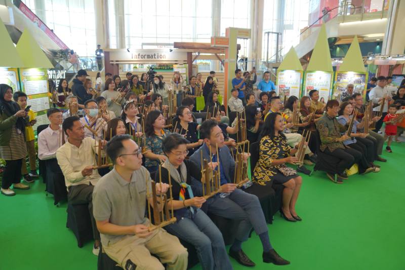 臺灣農遊展銷活動集結臺灣優質農遊資源促進印尼雙邊交流,現場分享印尼傳統樂器ANGKLUNG。