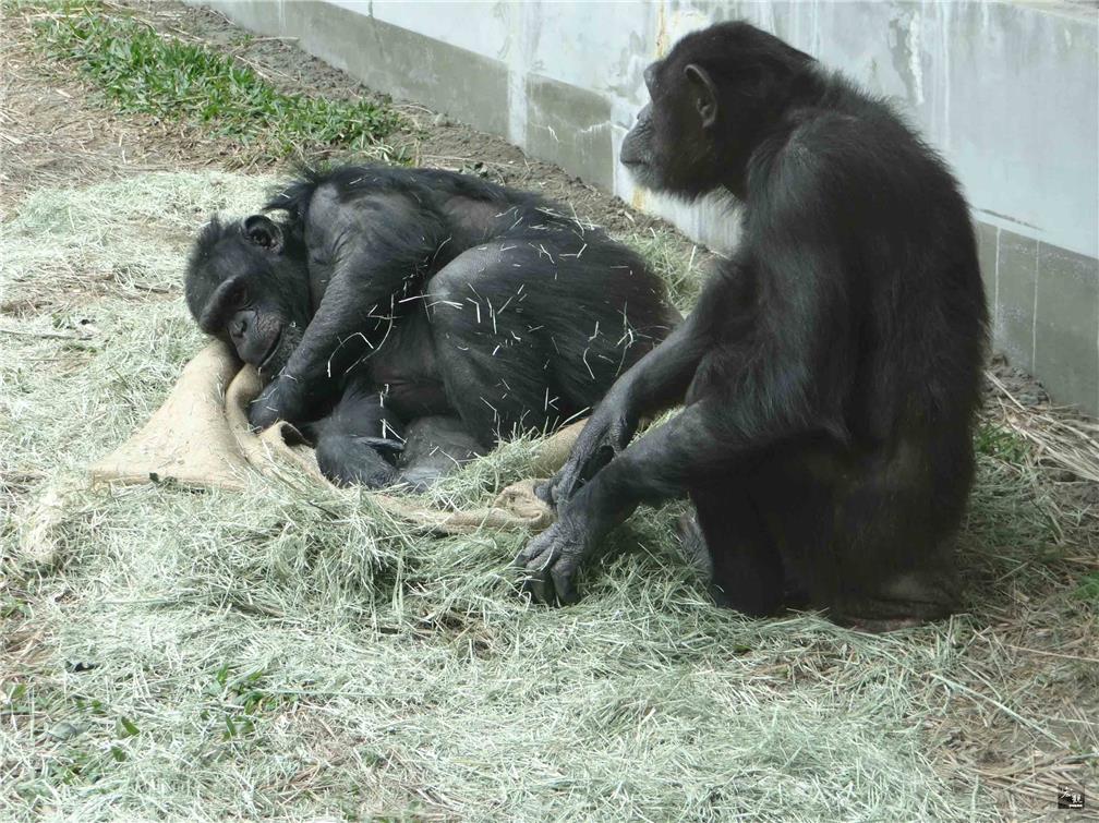 台北市立動物園表示,冬季氣溫太低時會展開保溫計畫,提供動物禦寒用品。黑猩猩「莎莉春」(左)拿乾草和麻布袋圍成1個保暖小窩。(中央社提供)