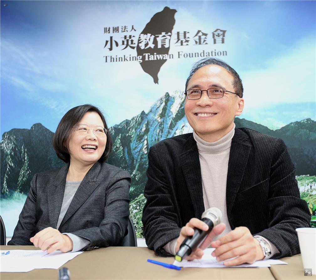 小英教育基金會執行長林全(右)日前率團參訪中國大陸,董事長蔡英文(左)20日陪同林全在台北舉行記者會,說明登陸情況。(中央社提供)
