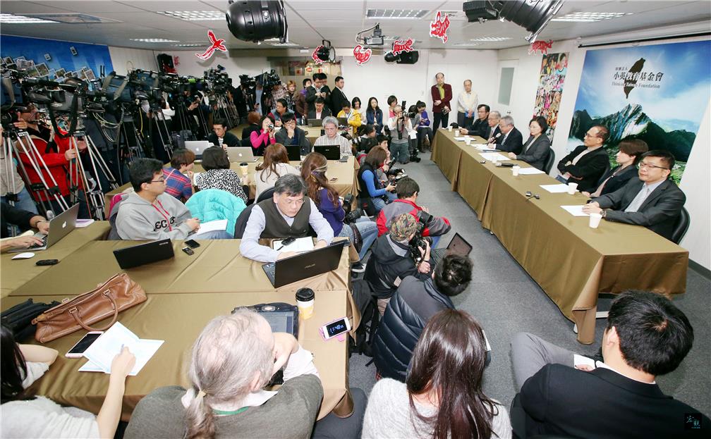 小英教育基金會執行長林全(右排右三)日前率團參訪中國大陸,董事長蔡英文(右排右四)20日陪同林全舉行記者會,說明登陸情況,大批媒體到場關注。(中央社提供)