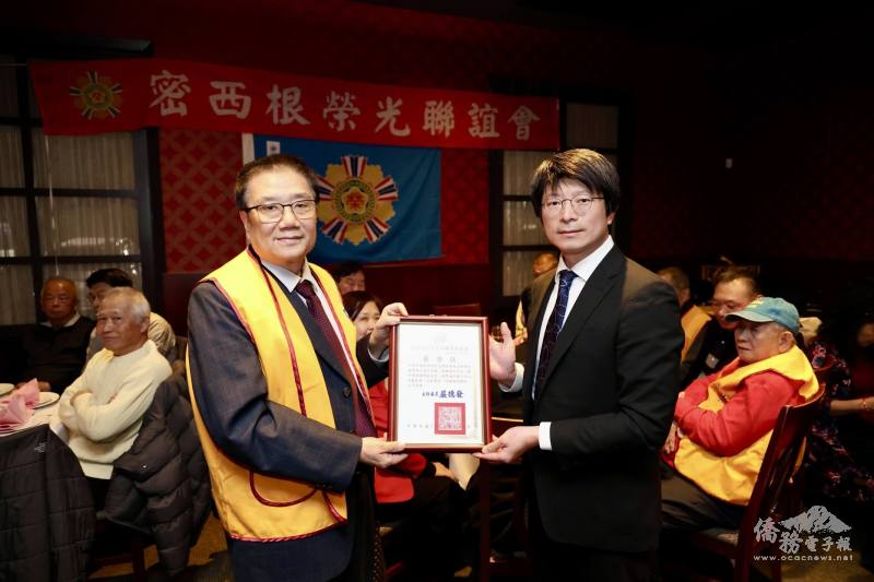密西根榮光聯誼會12月6日在法明頓市(Farmington)舉行年度盛會及慶祝榮民節,眾多榮民弟兄、榮眷、密西根僑務榮譽職、各社團負責人及僑胞鄉親齊聚一堂,芝加哥文教中心主任蔡季穎代表駐芝加哥辦事處處長類延峰專程出席,密西根僑胞也藉此機會,向即將調職返臺的蔡季穎獻上祝福,互道珍重。