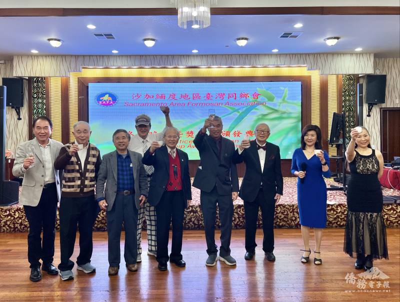 越南作家協會15日舉辦第三屆「浪左」詩歌頒獎典禮,頒發「文學貢獻獎」給9位貢獻國際文學交流的作家,台文筆會現任會長陳明仁(中)、前任會長陳正雄(右4)及現任秘書長蔣為文(左4)獲獎,為台灣作家首次獲此殊榮。(蔣為文提供)