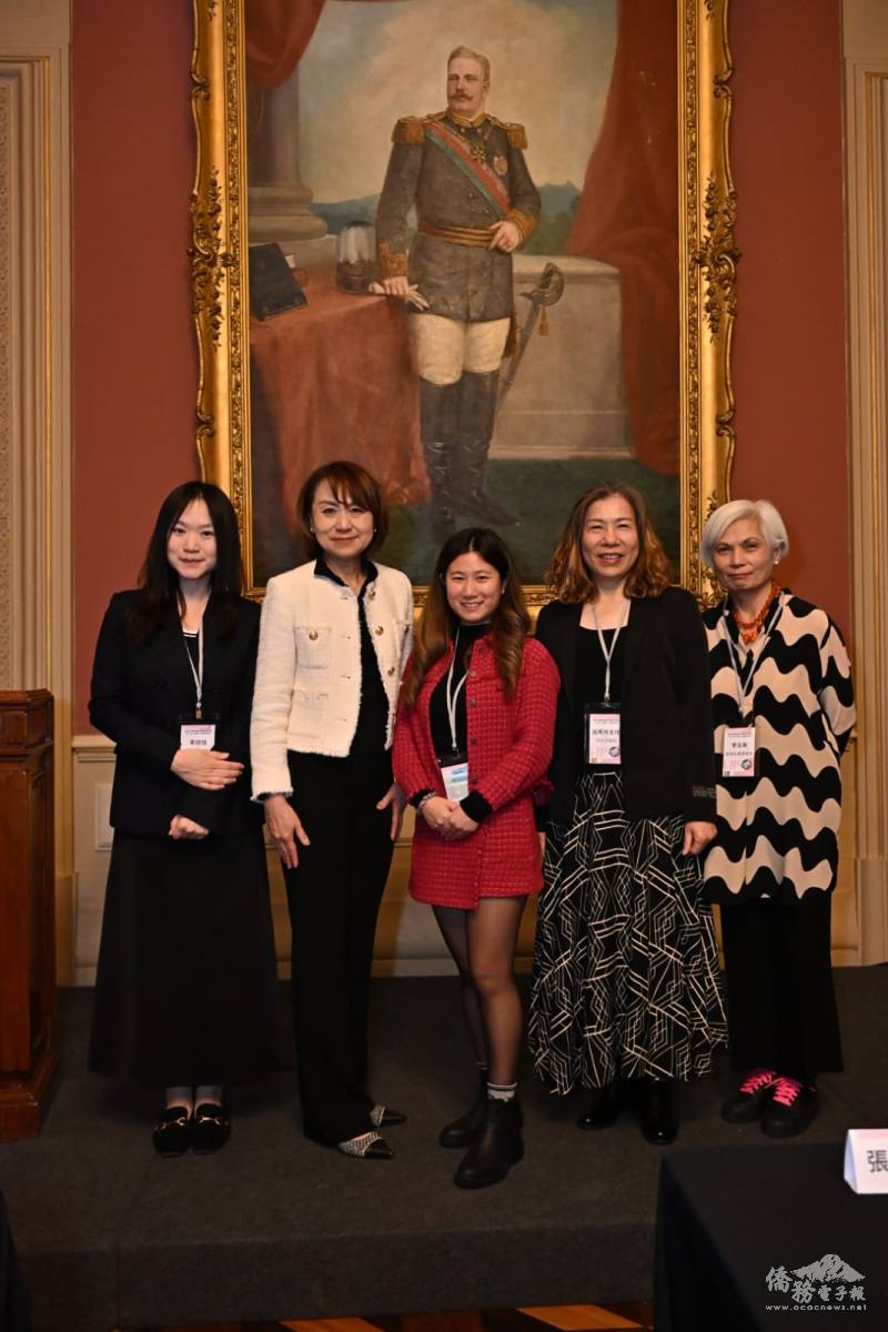 開幕典禮與會貴賓(由左至右為歐總總會長李欣恬、駐葡萄牙代表處大使張亞光、歐青會長陳妍、駐西班牙貿協主任呂秀玲、以及僑務委員李玉英)