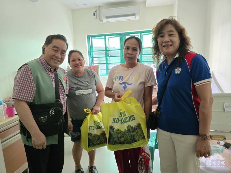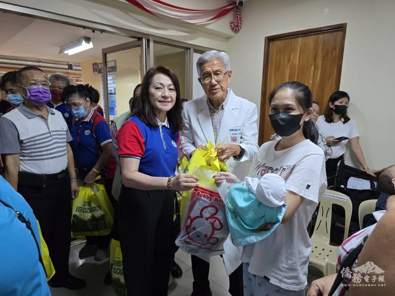菲華文經總會常務委員梁俊如(左)、中華崇仁總醫院院長洪鵬生(中)將民生物資交予病患家屬