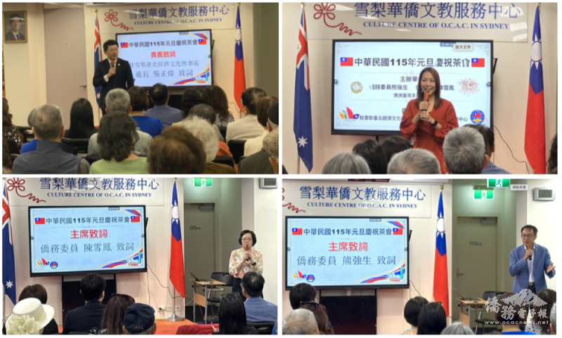 為慶祝中華民國115年元旦,雪梨僑界1月1日在雪梨文教中心舉行元旦茶會。活動由僑務委員熊強生及陳雪鳳共同主辦,澳洲臺灣多元文化協會會長簡明輝僑務促進委員協辦籌劃,駐雪梨辦事處處長吳正偉伉儷、雪梨文教中心主任江佳慧、雪梨臺貿中心主任蔡英庠、Willoughby臺裔市議員莊明雪、僑務榮譽職人員及雪梨鄉親超過百人出席,在溫馨隆重的氣氛中迎接新年。