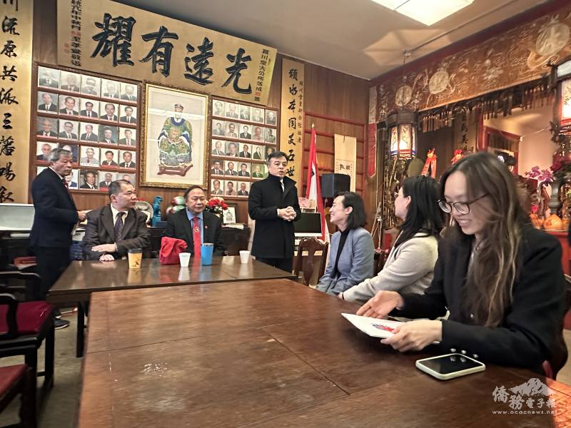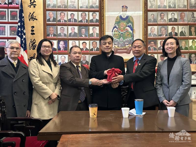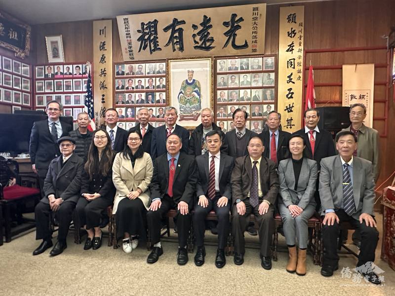 舊金山華埠陳潁川總堂1月2日舉行2026年職員交接就職典禮,駐舊金山辦事處處長伍志翔偕副組長張文榮及金山文教中心副主任劉岱欣受邀出席並監交。