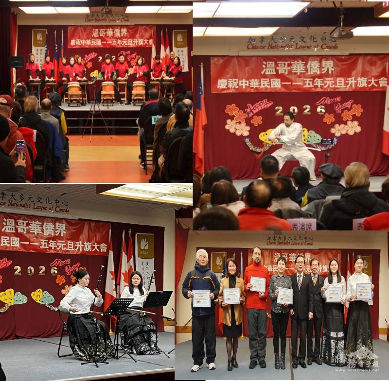 加拿大僑界舉辦中華民國115年元旦升旗典禮暨慶祝大會,1月1日在加拿大多元文化中心禮堂舉行。駐溫哥華辦事處副處長邱建義伉儷、僑務組組長郭淑貞親臨與會,大溫哥華臺灣僑界聯合會共同主席黃宗芹、謝明珠及張健理、溫哥華台灣貿易中心主任邱仕敏、僑務委員張亦凱等多位僑領以及多個僑社代表皆出席,與150位民眾共同歡慶元旦。