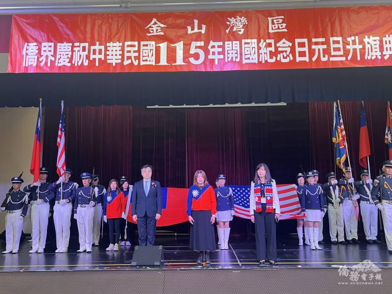 金山灣區僑學各界於元月1日,在金山灣區文教中心隆重舉行「慶祝中華民國115年開國紀念日元旦升旗典禮」。儘管元旦當天寒雨不歇,典禮臨時改於室內舉行,仍吸引超過600位僑胞與貴賓踴躍出席,在風雨中展現僑界團結向心,共迎新年。
