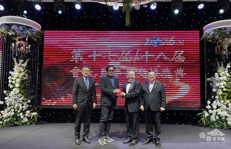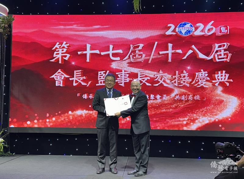 劉世忠代表僑委會委員長徐佳青頒贈賀狀予新任會長簡大翔