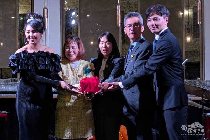 洛杉磯臺美商會青商部滿任會長曾愉雯(左1)在駐洛杉磯辦事處副處長陳令欣(中)與洛杉磯台美商會滿任會長、行政院政務顧問陳玲華(左2)以及洛杉磯台美商會會長簡志誠(右2)監交下將印信交接給新任會長楊如耀(右1)