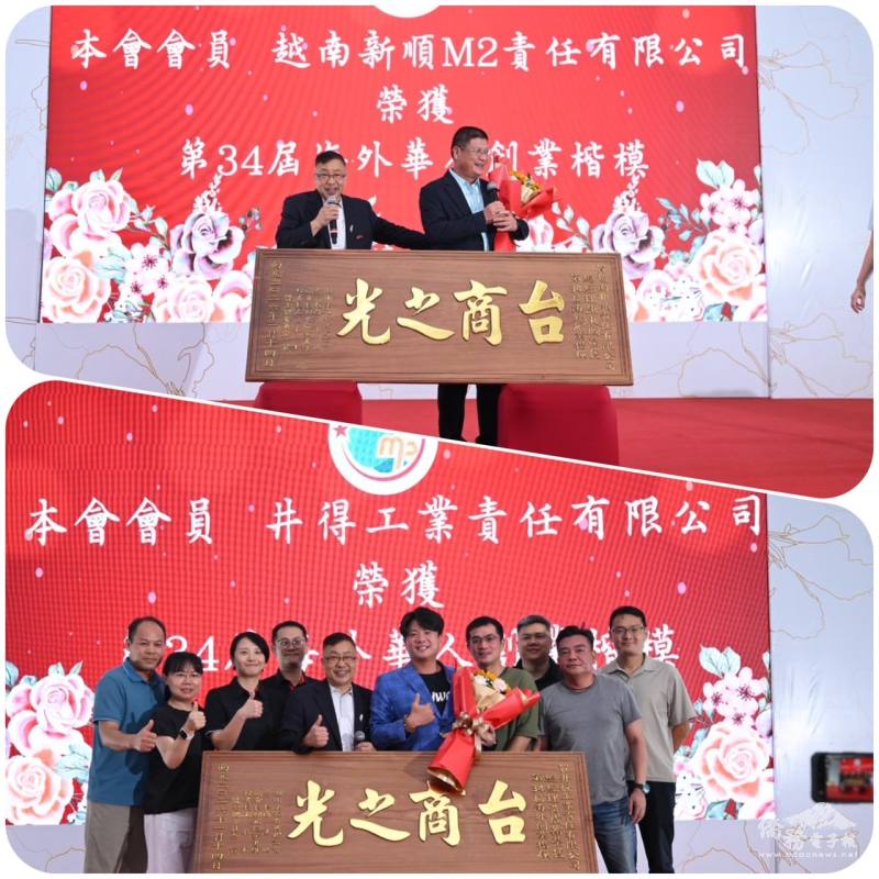 美福地區今年共有兩位會員榮獲全球僅 10 席的「創業楷模」大獎,分別為越南新順責任有限公司總經理陳東城 及 井得工業責任有限公司負責人黃威翰殊榮難得。聯誼會於晚會頒贈「美福台商之光」匾額,與會員一同分享這份榮耀與喜悅。