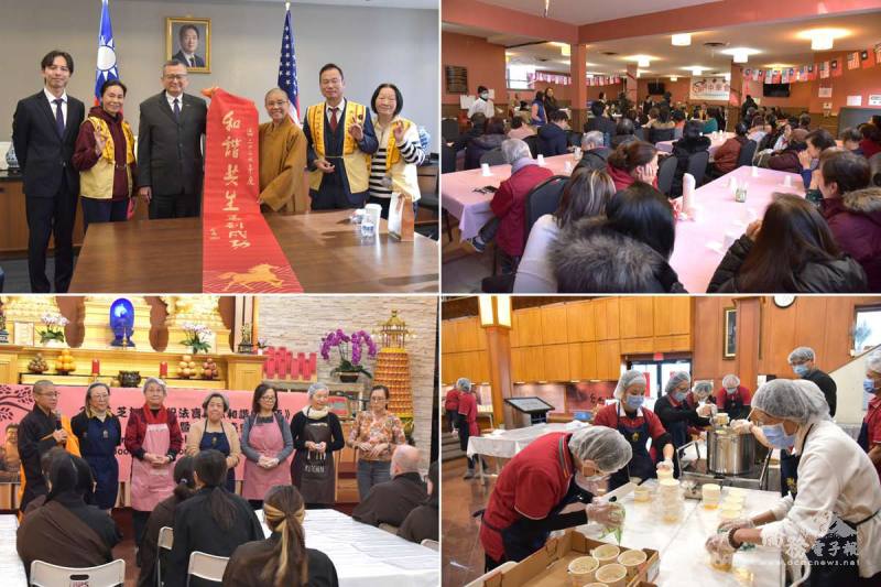 佛光山致贈新春長聯予駐芝加哥辦事處 (左上) ;中華會館耆老歡迎佛光山 (右上) ;住持永瀚法師感謝伙食班的辛勞 (左下) ;佛光山義工裝盒臘八粥 (右下)