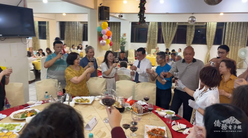 僑務秘書吳婉郡(左四)、僑務委員郭鳳文(左三)與會長羅滿志(左五)逐桌向在場僑胞祝賀新年快樂並致意