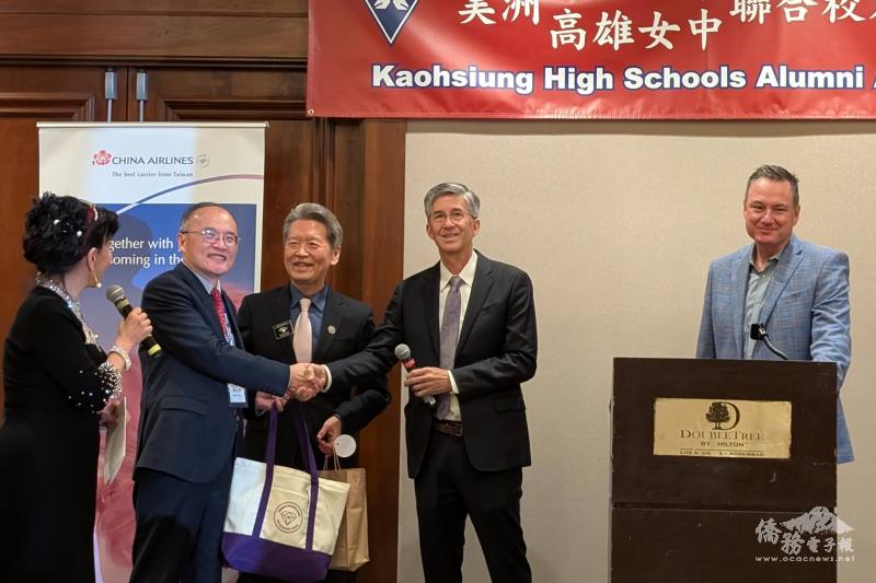 高雄女中校長鄭文儀(左2)致贈鑽石吧高中校長David Hong(右2)紀念禮物,核桃市學區總監Dr. Robert P. Taylor(右1)及學區教委主席佟儀(右3)亦一同受贈