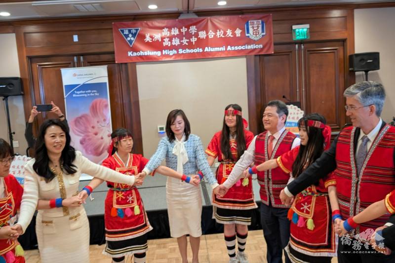 高雄女中學生與紀欽耀(右3)、David Hong(右1)及美洲雄友會會長許書怡(左1)一同體驗臺灣原住民文化舞蹈