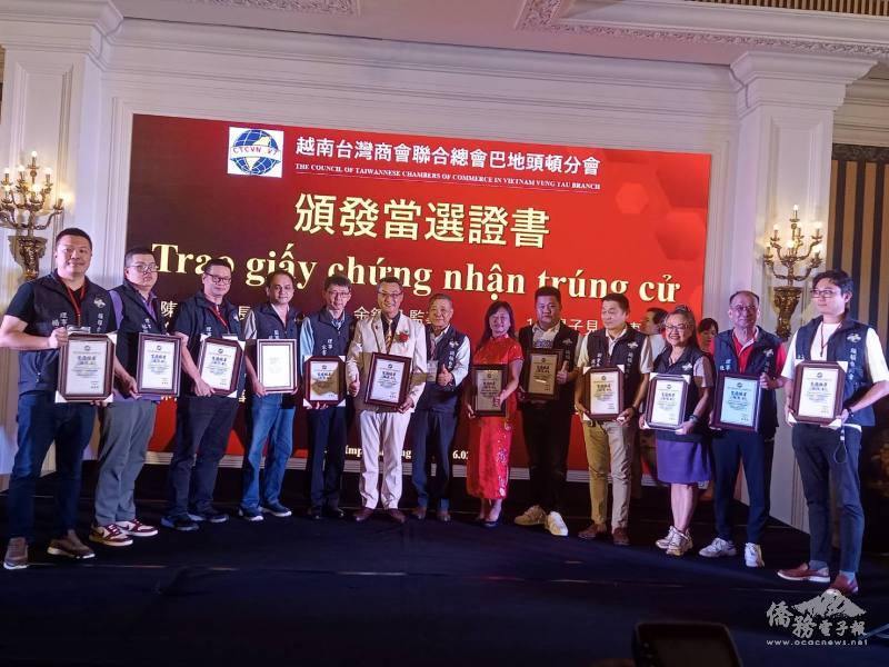 典禮中,選務主任委員柯清茂頒發當選證書予陳威光及監事長謝淑婷,韓國耀則代表僑委會委員長徐佳青頒發賀狀,期許新屆團隊持續帶領商會穩健發展。