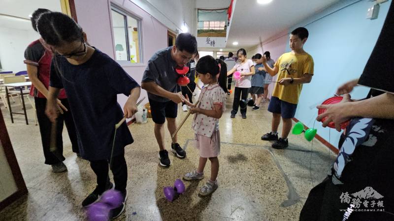 阿根廷文化種子教師莊廉光於夏令營課程中指導學生學習扯鈴,孩子在實作中體驗傳統技藝