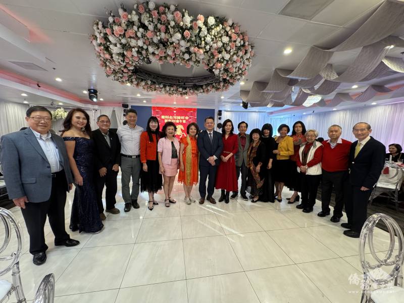 駐洛杉磯辦事處處長紀欽耀夫婦(中) 及爾灣市議員劉令淳(右二)出席柑縣臺鄉會2026新年辦桌午宴