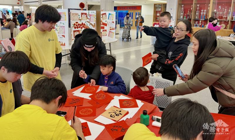 在攤位的另一端,由FASCA學員 Justin Chen 示範寫春聯,他表示,漢字不但筆畫優美,每一張春聯裡都滿載祝福。吸引了許多人駐足觀賞,甚至有熱衷書法的民眾,忍不住也提筆大顯身手。FASCA學員也提供春聯讓民眾索取討吉利,傳遞馬年好運,讓整個社區充滿勁能與福氣。