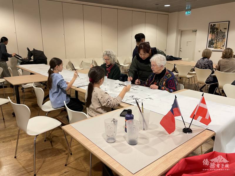 龍華國中劉紫樺老師(右二)帶僑胞學寫書法與春聯,孩童開心將自己的名字寫在春聯紙上。