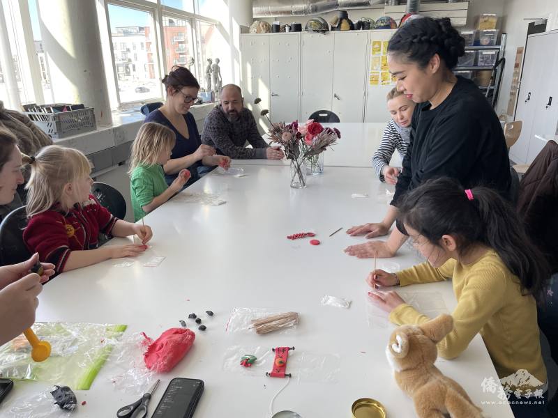 臺僑第二代Marli(右一)一起參與黏土鞭炮的製作。劉孟圓(右二)擔任教學。