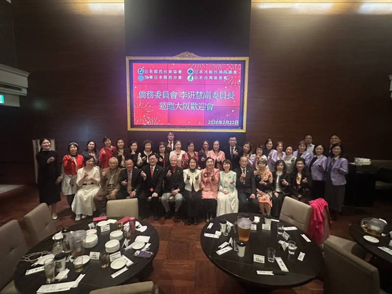 僑務委員會副委員長李姸慧2月22日在僑務秘書黃麗婷陪同下,出席由日本關西臺商協會、日本大阪臺灣同鄉會、世界華人工商婦女企管協會日本關西分會及日本臺灣後援會共同舉辦的歡迎晚宴,關西僑界領袖及代表40餘人出席,氣氛隆重熱絡。