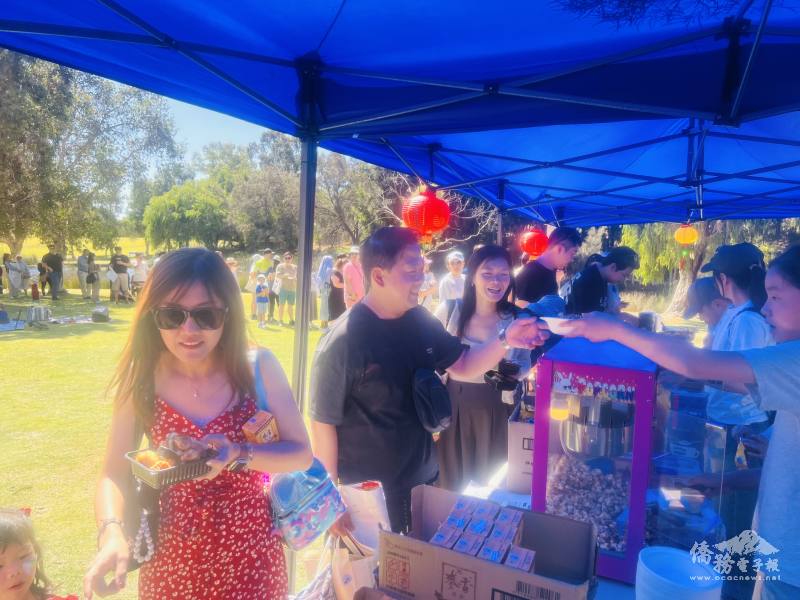 主辦單位更準備鹽酥雞、台灣香腸、爆米花、壽司及三明治供僑民享用;聯誼會副會長鄧如君展出春聯書法撰寫攤位,吸引民眾現場揮毫,寫下對新年的美好祝福;佛光山西澳中華學校的捏麵人、臉部彩繪及扯鈴攤位,也吸引家長帶著小朋友一同手作,度過親子時光。